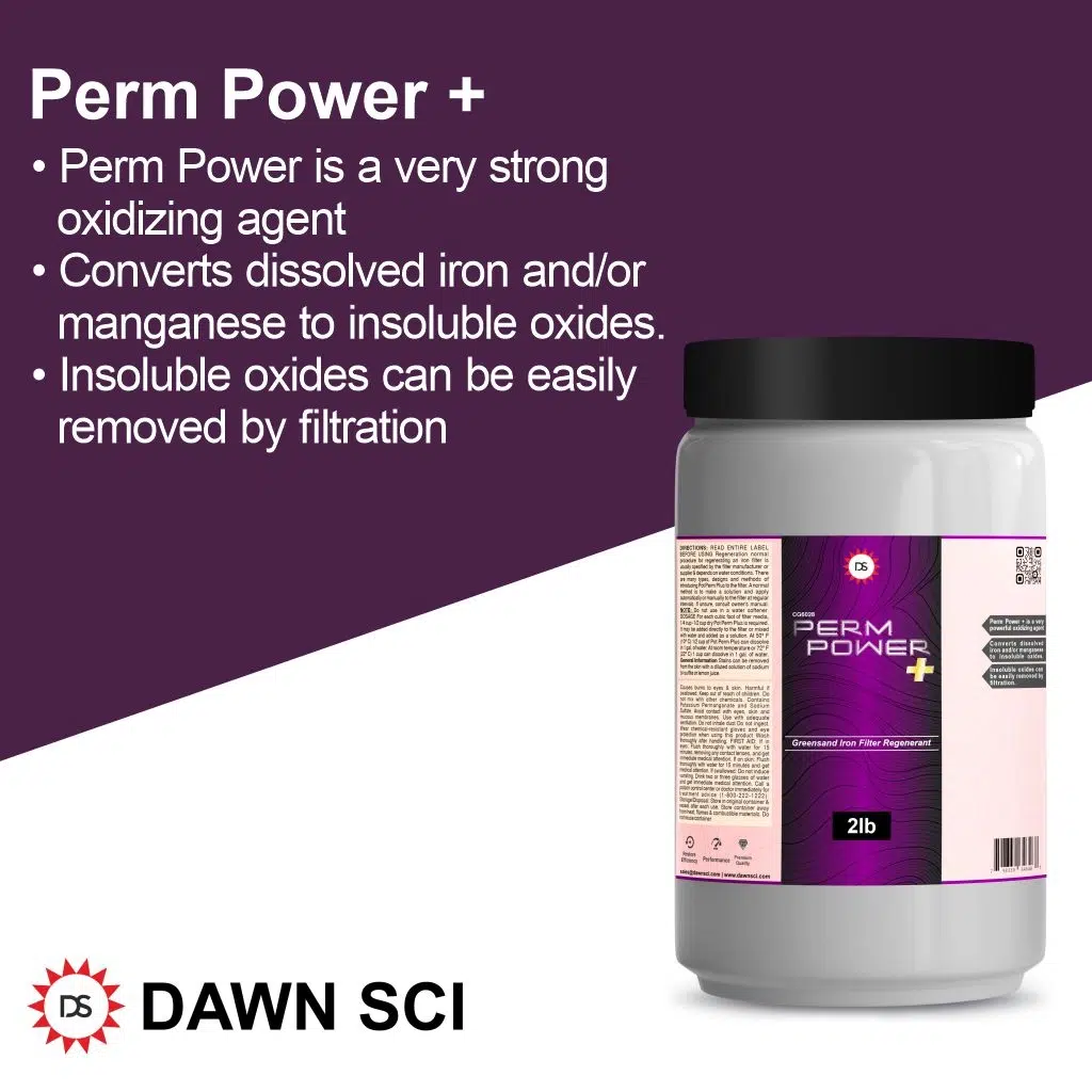Dawn Sciβs innovative product βPerm Powerβ & βPerm Power Plusβ are design especially for Greensand Iron Filters. Its advanced formula converts dissolved iron and/or manganese to insoluble oxides which can easily be removed through filtration. Perm Powerβ & βPerm Power Plus regenerates and oxidizes greensand iron filter media, restoring the exchange capacity of the unit.